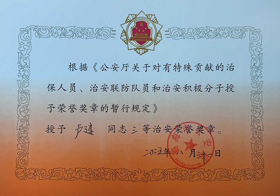 9月8日上午,受临海市公安局防控治理大队委托,大洋派出所灵湖警务区警长潘斌来到忠信混凝土公司,给公司生产中心安环主管卢建颁发一枚三等治安荣誉奖章和一份获奖证书,以表彰他在公司危化物品管理、社会治安信息反馈方面所作出的成绩。